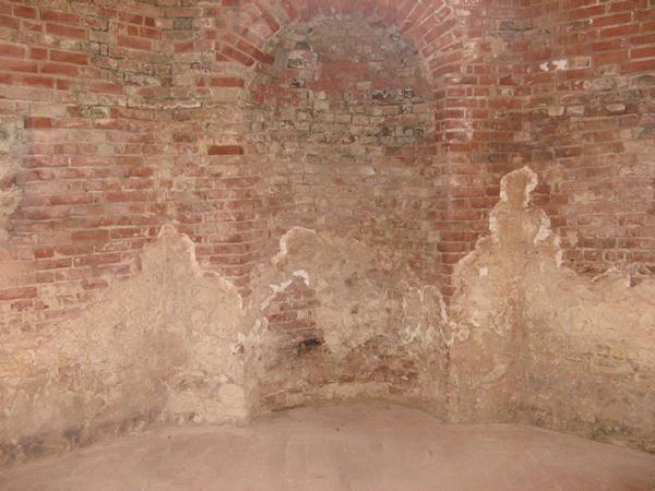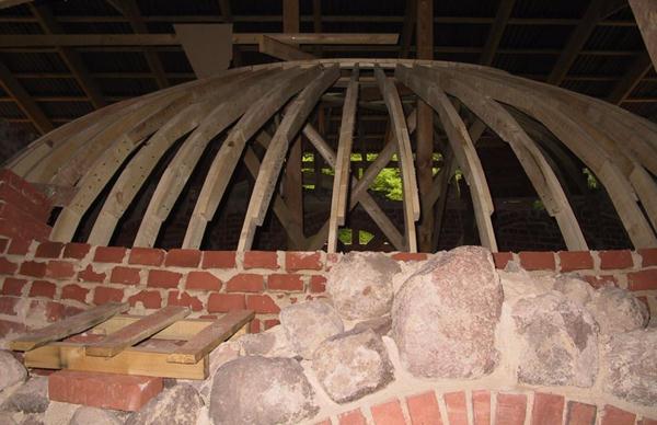 Das abgeflachte Gewölbe des Hauptsaals wurde mit Hilfe einer Schablone wieder aufgeführt. Der Gewölbedurchmesser und die Höhe des Hauptsaals sind identisch. Das zentrale Deckenauge des Saales konnte mit den wiedergefundenen Ringsegmenten aus Sandstein rekonstruiert werden. Diese Öffnung verbindet den Hauptsaal mit dem darüber befindlichen kleinen Kuppelraum. Ehemals war der Hauptsaal verputzt und bemalt: „Die Decke des oberen Gewölbes zeigt in frischen Farben die Bilder der Eitelkeit, scherzende und lachende Mädchen, Sinnbilder der vorbeirauschenden Freuden der Erde“.